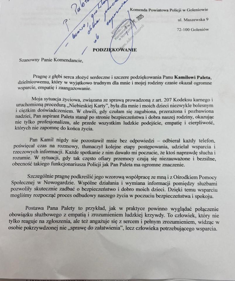 Asp. Kamil Paleta z Komisariatu Policji w Nowogardzie otrzymał pisemne podziękowania od mieszkanki powiatu za wsparcie i empatię w trudnym okresie rodzinnym. Autorka listu zaznaczyła, że dzięki jego postawie ona i jej dzieci odzyskali poczucie bezpieczeństwa i spokoju.