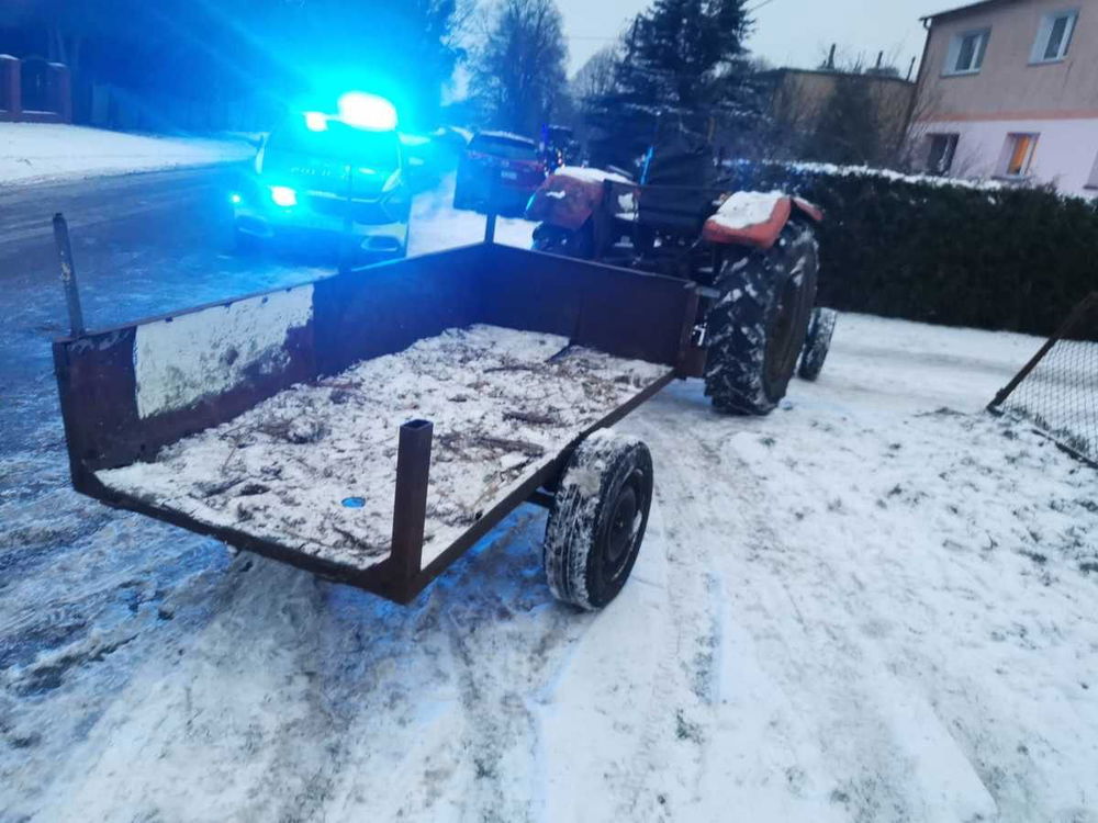 Kontrola pojazdu ujawniła kolejne nieprawidłowości. Ciągnik nie był zarejestrowany, nie posiadał obowiązkowego ubezpieczenia OC ani numeru VIN. Te same braki stwierdzono w dokumentach przyczepy, z którą poruszał się pojazd.