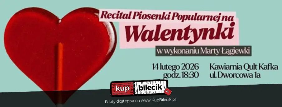 | Marta Robi Scenydodano 2026-01-13 19:15:19 Marta robi sceny koncertowo, czyli Recital Piosenki Popularnej na Walentynki to muzyczna podróż, która zabiera widzów do wspaniałego świata piosenek. Podczas recitalu można wysłuchać utworów, które kiedyś nuciła cała Polska, a nawet cały świat. W aktorskiej interpretacji Marty Łągiewki, aktorki Teatru Lalek Pleciuga i współtwórczyni Fundacji Tettere i przy akompaniamencie Agnieszki Barańskiej, zabrzmią piosenki m.in. A. Osieckiej, W. Młynarskiego, Kabaretu Starszych Panów i L. Cohena. Będzie zabawnie, miłośnie, wzruszająco i nastrojowo, a że nic tak nie łączy ludzi jak muzyka, będzie to także wspaniała okazja, aby wspólnie wyśpiewać miłość do drugiej osoby, samego siebie i całego świata. Śpiew: Marta Łągiewka Akompaniament: Agnieszka Barańska Kawiarnia Qult Kafka Recital Piosenki Popularnej na Walentynki artyści: Marta Łągiewka, Agnieszka BarańskaMarta robi sceny koncertowo, czyli Recital Piosenki Popularnej na Walentynki to muzyczna podróż, która zabiera widzów do wspaniałego świata piosenek. Podczas recitalu można wysłuchać utworów, które kiedyś nuciła cała Polska, a nawet cały świat. W aktorskiej interpretacji Marty Łągiewki, aktorki Teatru Lalek Pleciuga i współtwórczyni Fundacji Tettere i przy akompaniamencie Agnieszki Barańskiej, zabrzmią piosenki m.in. A. Osieckiej, W. Młynarskiego, Kabaretu Starszych Panów i L. Cohena. Będzie zabawnie, miłośnie, wzruszająco i nastrojowo, a że nic tak nie łączy ludzi jak muzyka, będzie to także wspaniała okazja, aby wspólnie wyśpiewać miłość do drugiej osoby, samego siebie i całego świata. Bilety do nabycia na: KupBilecik.pl |