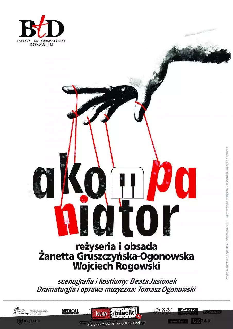 bilety: "Akompaniator" - komedia z elementami makabreski z nagłymi zwrotami akcji i mistrzowskimi pojedynkami aktorskimi. Śpiewaczka operowa i jej nieśmiały akompaniator spotykają się na próbie. On zakochany w niej beznadziejnie od trzydziestu lat, ona nieświadoma jego uczucia. Uczucie, które jest - najdelikatniej mówiąc - bardzo dziwne… Spektakl zrealizowany w ramach Sceny Inicjatyw Aktorskich biorący udział w 28. Ogólnopolskim Konkursie na Wystawienie Polskiej Sztuki Współczesnej. Akompaniator - BTD artyści: Bałtycki Teatr Dramatyczny"Akompaniator" Anny Burzyńskiej, wspaniała komedia z elementami makabreski, nagłymi zwrotami akcji i mistrzowskimi pojedynkami aktorskimi. Śpiewaczka operowa i jej nieśmiały akompaniator spotykają się na próbie. On zakochany w niej beznadziejnie od 30 lat, ona nieświadoma jego uczucia. Uczucia, które jest - najdelikatniej mówiąc - bardzo dziwne… Bilety do nabycia na: KupBilecik.pl |